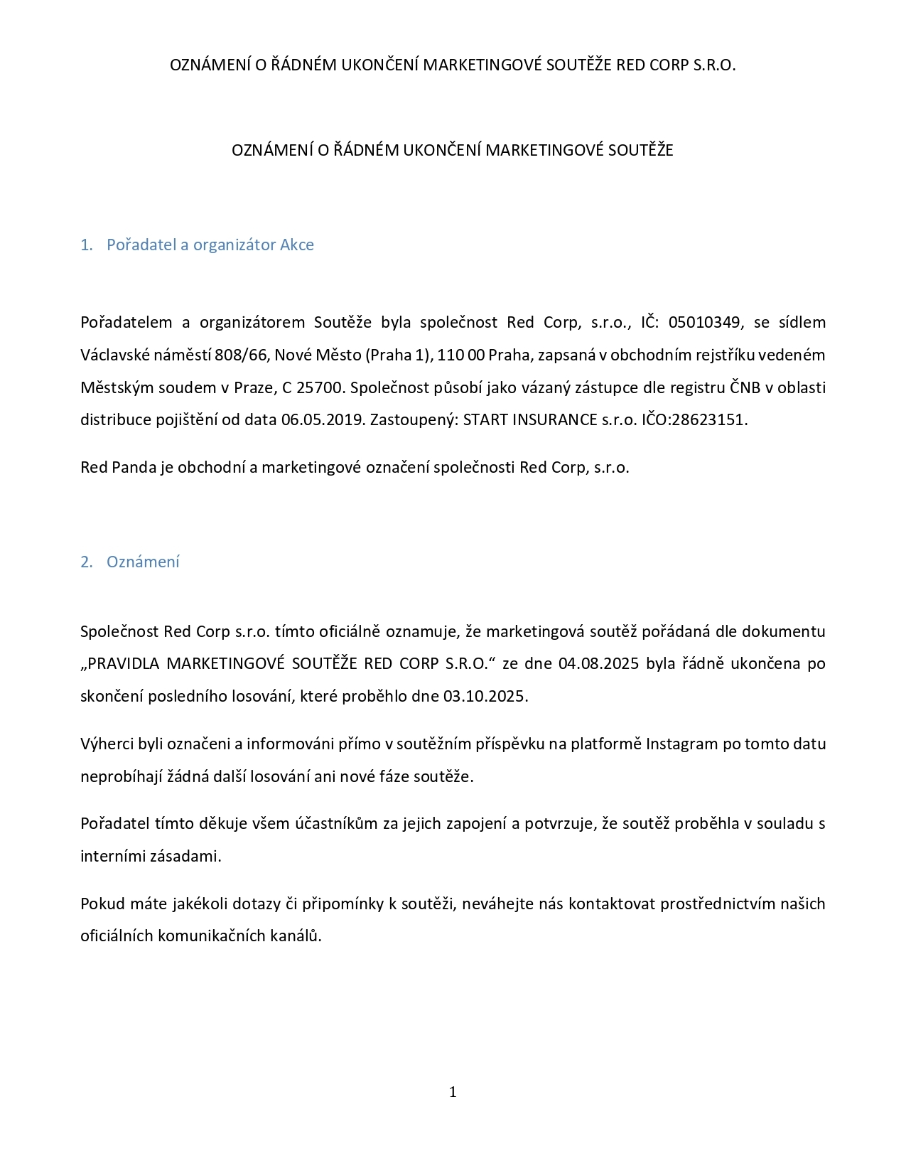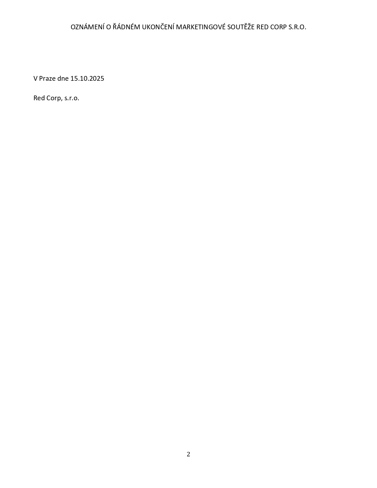 OZNÁMENÍ O ŘÁDNÉM UKONČENÍ MARKETINGOVÉ SOUTĚŽE